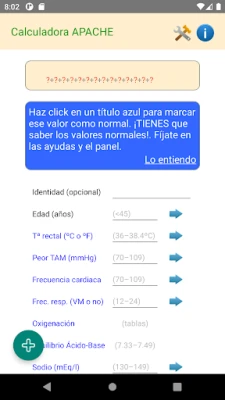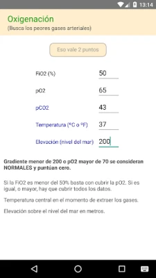 - Oxygenation screen to place worst gasometry. A-a gradient will be calculated if needed. - Arterial pH or serum HCO3 in the Acid-Base Balance screen. - Integrated GCS Calc. - Chronic diseases screen with details. - APACHE II and predicted death rate (not adjusted). - Disclaimer screen shows points stored under each section to help testing. - Support Celsius and Fahrenheit degrees. - Test buttons to try different values if you don't know which ot them is worse than the others.
