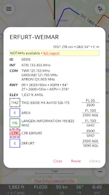 Enroute features a moving map similar in style to the official ICAO maps. Your current position and your flight path for the next five minutes are marked, and so is your intended flight route. A simple tap gives you all the information about airspaces, airfields, and navaids – complete with frequencies, codes, elevations, and runway information.